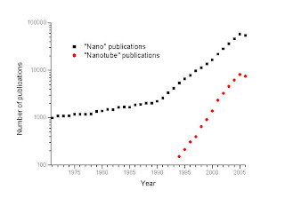 Idag är nanoteknologi “big business”! I USA finns National Nanotechnology Initiative som har 1,2 miljarder dollars i funding under 2007. En sökning på Google ger nästan 15 miljoner träffar på “nanotechnology” Tusentals forskare världen runt producerar tiotusentals artiklar årligen. Nature har startat en ny tidskrift, Nature Nanotechnology. En sökning i CAS på ordet “nano” ger en inblick i utvecklingen inom området1. En nästan perfekt exponentiell tillväxt. En titt i de senaste veckornas nummer av ett par nano-tidskrifter ger ett femtiotal nanoord till listan, förutom nanotuber också ord som nanoribbon, nanochannel, nanowhisker, nanofracture, nano-explosion, nanovoid…